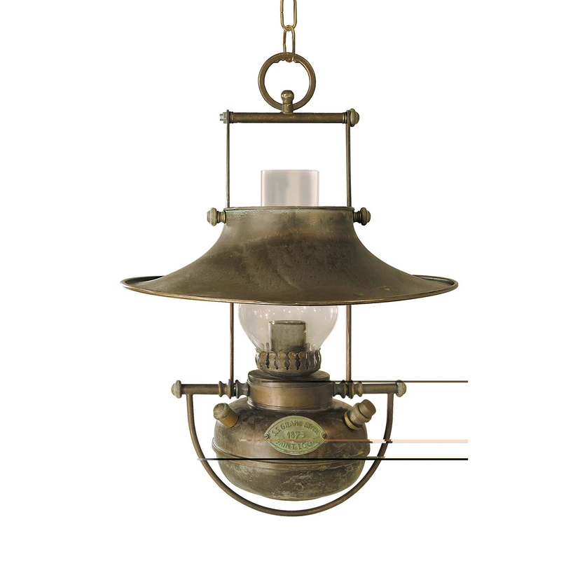 Ein aufgestanztes Emblem mit der Aufschrift "GRAND RIVER", ein kolbenförmiges Leuchtenglas und nicht zuletzt die Patina der Altmessingoptik sorgen für das antike Design, wodurch die Hängeleuchte als besonderes Highlight im individuellen Einrichtungsstil für ein stilvolles Ambiente sorgt.