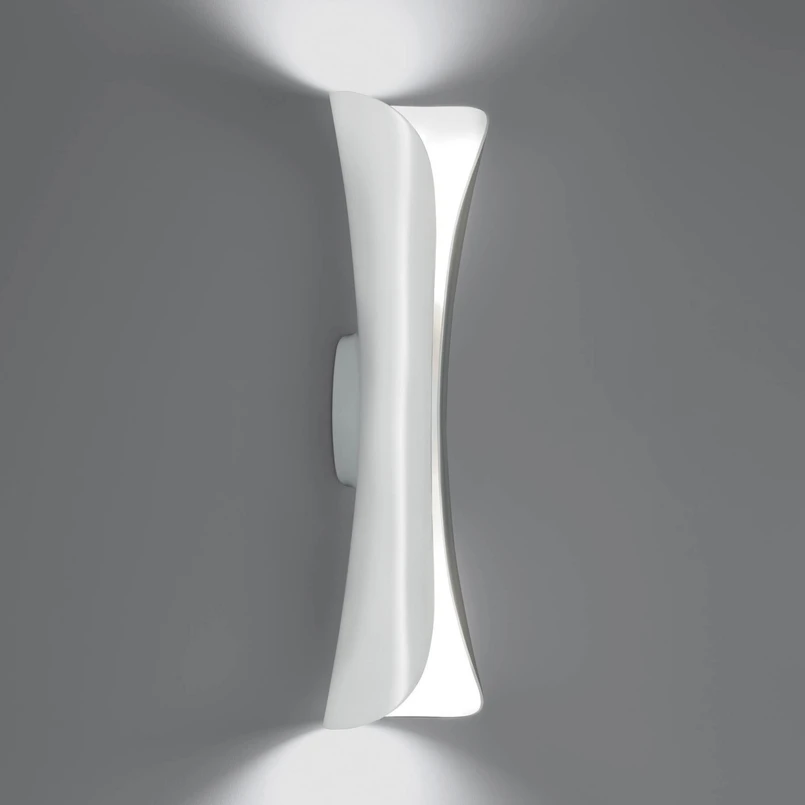Die LED-Wandleuchte Cadmo ist einer von unzähligen Entwürfen des Designers Karim Rashid für das italienische Leuchtenunternehmen Artemide. Die schmale Wandleuchte wirkt mit ihrer geschwungenen Form elegant und besonders im eingeschalteten Zustand unglaublich effektvoll. Das warmweiße Licht der beiden mitgelieferten GU10-LED-Lampen strahlt aus den vertikalen Öffnungen des zur Front geschlossen Korpus, wobei breite und diffuse Lichteffekte ober- und unterhalb an der Wand entstehen.