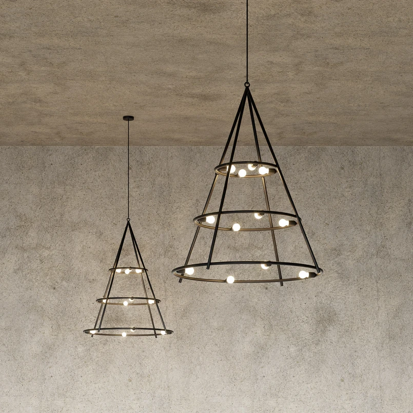 Bestehend aus einem stabilen, starren Konstrukt begeistert El Porís mit seiner eleganten, stilvollen Optik. Wie ein Kegel formen die schwarzen Metallstreben die Basis, an der insgesamt drei unterschiedlich große Ringe integriert sind, die die zwölf Fassungen enthalten. Die Fassungen sind an der Innenseite angebracht und somit nach innen und sich gegenüber ausgerichtet. Die geometrische Struktur mit ihren ungewöhnlich großen Dimensionen vereint zeitgemäßes Design mit traditionellen Lichtquellen und gibt so die Freiheit bei der Wahl der Leuchtmittel. Durch die Ausrichtung wird ein stimmungsvolles, umfassendes Lichtbild erzeugt, bei dem die Helligkeit in den Raum getragen wird.