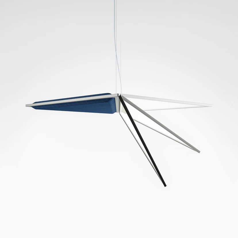Die Hängeleuchte Flexia besteht zum Teil aus recycelten PET-Flaschen, zum Teil aus anderen recycelten Kunststoffen und ist mit einer Akustikplatte versehen, die die im Raum reflektierten Schallwellen absorbiert. Die transparente Abstrahlungsfläche in patentierter Discovery-Technologie dagegen ist für eine gleichmäßige, komfortable und diffuse Lichtemission verantwortlich. Die flexiblen Flügel der Leuchte mit einem Drehmechanismus ermöglichen auf die Interaktion mit der Umgebung abstimmbare Neigungen und Positionen. Die Hängeleuchte erfüllt die UGR-Normen für die Anwendung in Arbeitsumgebungen und ist daher bestens für den Einsatz in Büros oder Besprechungsräumen geeignet.