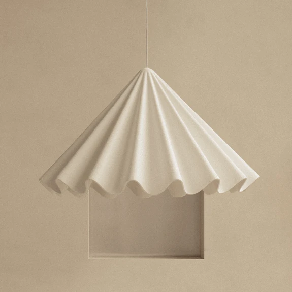 Diese elegante und feminine Form äußert sich nicht nur in der optischen Gestaltung der Leuchte, sondern auch in der Materialwahl. Hergestellt aus PET-Filz, ist der Schirm alles andere als gewöhnlich. Das recycelbare Material ist ein klares Statement und ein Appell an eine nachhaltige Produktion.