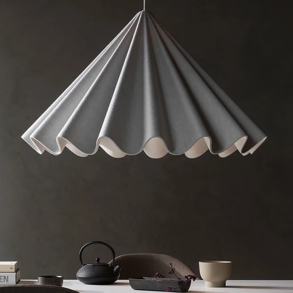 Diese elegante und feminine Form äußert sich nicht nur in der optischen Gestaltung der Leuchte, sondern auch in der Materialwahl. Hergestellt aus PET-Filz, ist der Schirm alles andere als gewöhnlich. Das recycelbare Material ist ein klares Statement und ein Appell an eine nachhaltige Produktion.