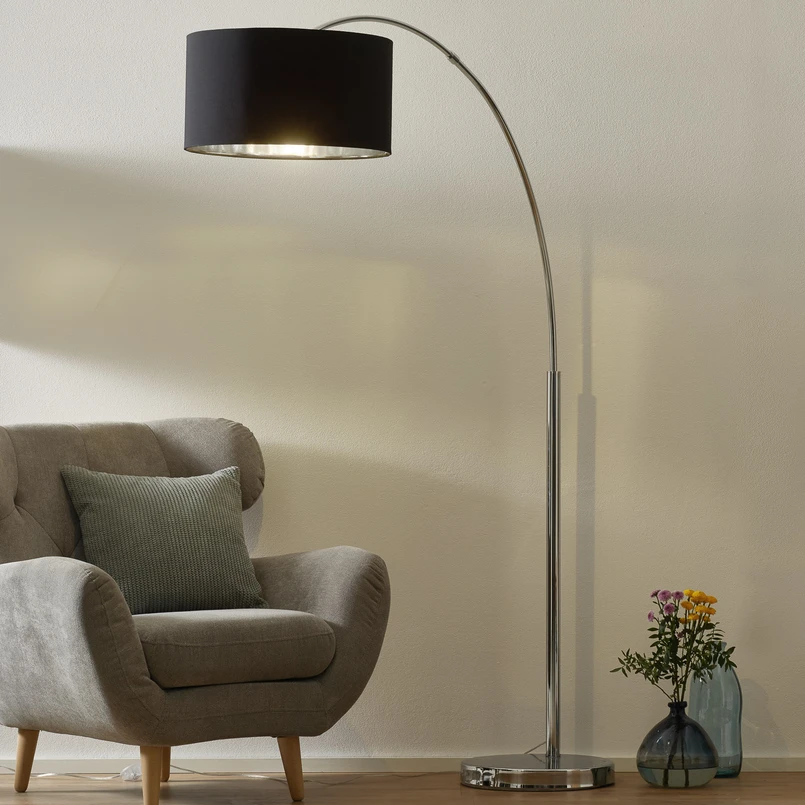 Die Bogenleuchte Mara kommt vor allem in großen, weiträumigen Wohnzimmern zur Geltung. Dort spendet sie dann helles Licht, das beispielsweise einen Tisch oder den Leseplatz auf dem Sofa gleichmäßig beleuchtet. Das Design aus glänzendem Chrom und mattschwarzem Stoff setzt dabei moderne Akzente, ohne die vorhandene Einrichtung zu stören. Mara - eine elegante Bogenleuchte für viele Gelegenheiten.