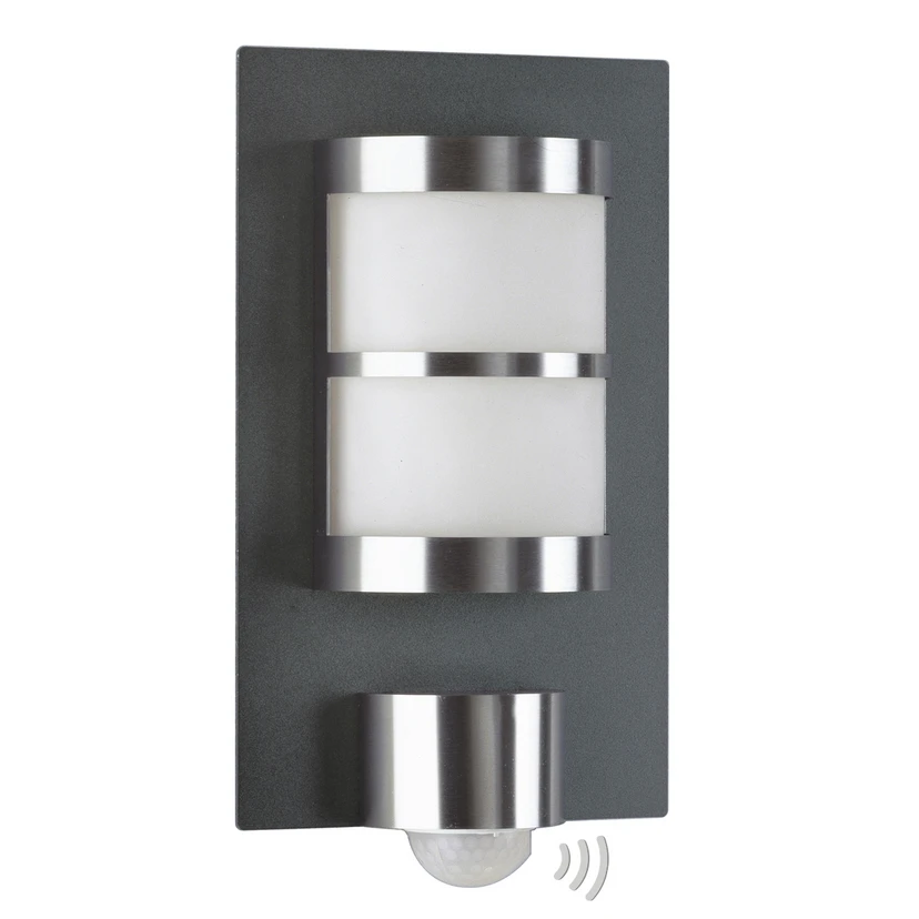 Die Außen-Wandleuchte Adonia mit Bewegungsmelder besteht aus anthrazitfarbenem Edelstahl sowie Opalglas und die Montageplatte ist aus Aluminiumguss. Praktisch und stilvoll zugleich durchbricht sie die Dunkelheit.