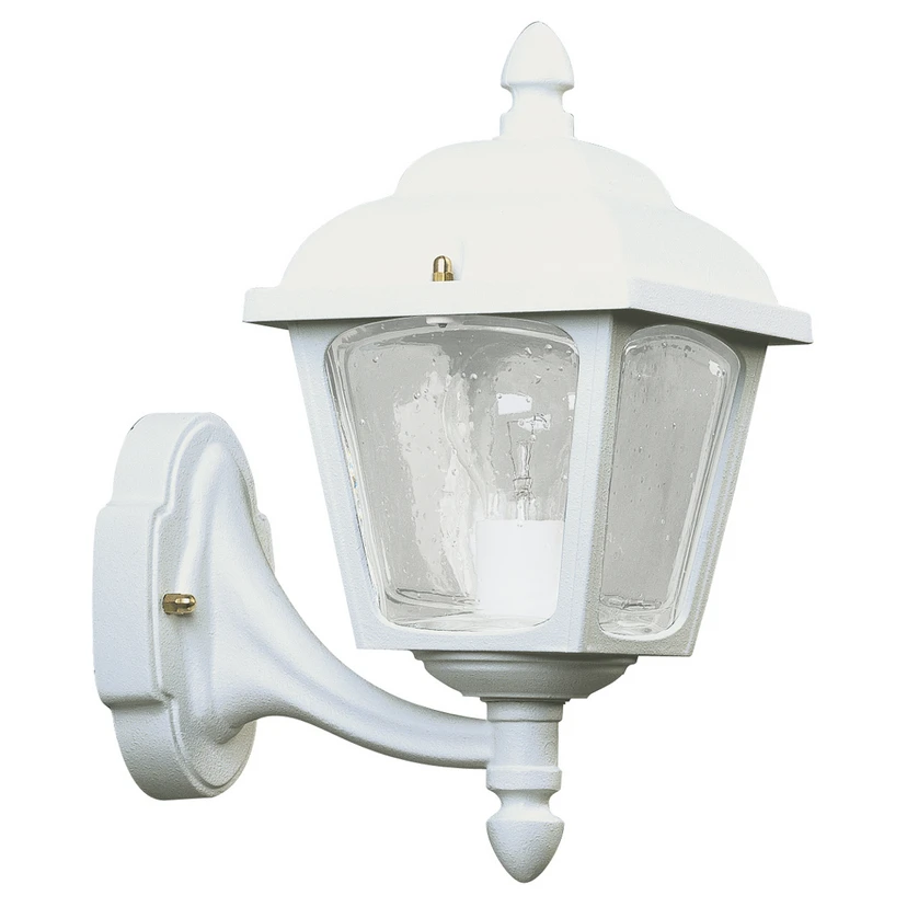 Diese schöne Außenwandleuchte in traditioneller Laternenform mit aufwärts gerichteter Laterne ist aus robustem Aluminiumguss sowie Hohlglas gearbeitet und wirkt äußerst stilbetonend. Mit Schutzart IP44 ausgestattet. Lieferung inklusive Montageplatte.