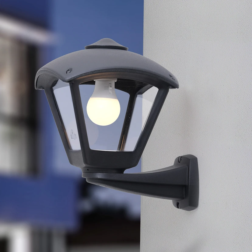 Diese aus Kunstharz gefertigte Außenwandleuchte in Schwarz zeichnet sich durch ihren laternenförmigen Lampenschirm Dario aus, der mit vier klaren Abdeckungen aus PMMA versehen ist. Hinzu kommt die Anbau-Wandbefestigung Nardo. Das beiliegende E27 LED-Leuchtmittel ermöglicht die Auswahl von warmweißem, universalweißem oder tageslichtweißem Licht per Schieberegler direkt am Leuchtmittel.