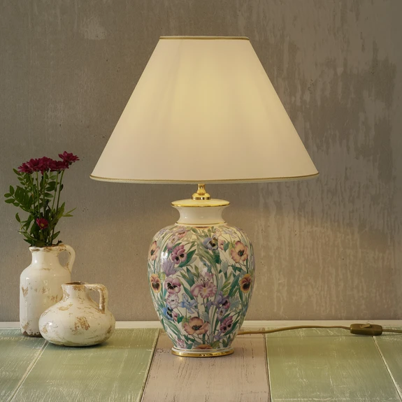 Bei Giardino Panse handelt es sich um eine sehr ansprechende Tischleuchte in klassischem Design. Durch den weißen Grundton des Lampenschirms hält sich die Leuchte dezent im Hintergrund und kann an vielerlei Orten eingesetzt werden, wo sie garantiert für schöne Beleuchtung sorgt. Das besondere Highlight ist das in die Oberfläche eingebrannte, florale Motiv, das zahlreiche unterschiedliche Blumen zeigt, die sich in Rosa- und Violetttönen präsentieren und an Frühling und Sommer erinnern. Ein meisterliches Kunsthandwerk mit Liebe zum Detail. 24 Karat vergoldet.