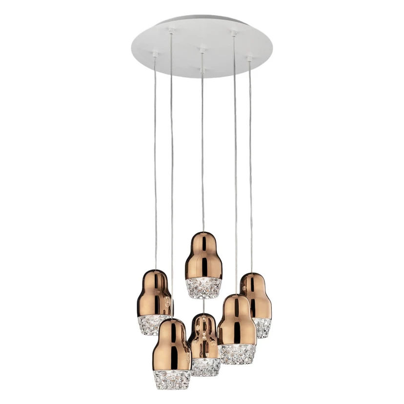 Wer seinen Wohnraum mit einem ganz besonderen Lichtspender schmücken will, für den ist die sechsflammige Hängelampe Fedora die richtige Wahl: Hier hängen sechs Lampenschirme in unterschiedlicher Höhe von der Decke herab, die schon aufgrund ihrer Gestaltung - der obere Teil besteht aus Aluminium mit Metallic-Finish in Rosé-Gold, der Rand aus hübsch strukturiertem Klarglas - dem Raum strahlenden Glanz verleihen. Hinzu kommt die Lichtreflexion der LED-Lampen. Die Leuchtmittel sind jedoch nicht Bestandteil des Lieferumfangs (über Zubehör erhältlich: 6 x max. 7,5 W LED, GU10).