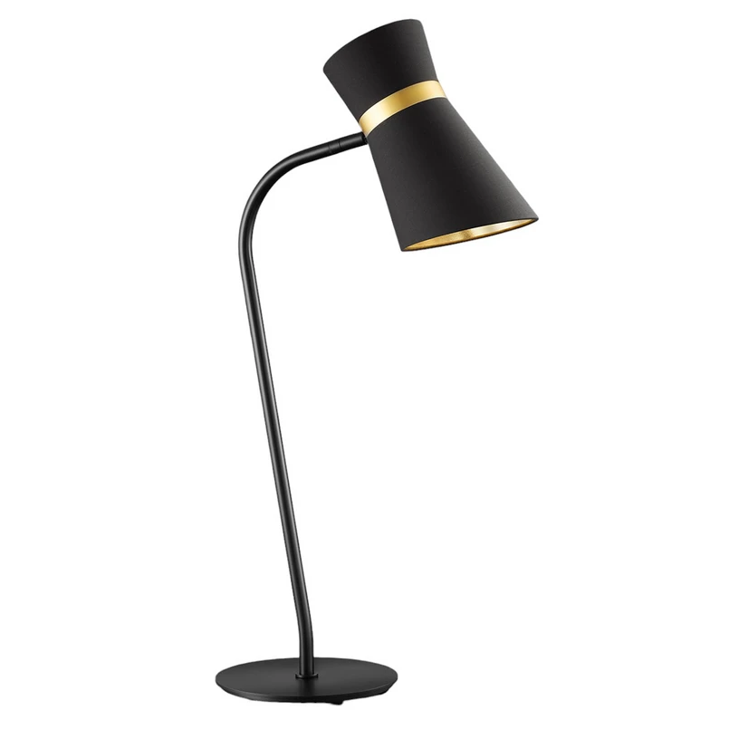 Die Tischleuchte 13.326.03-4205 ist eine moderne Zusatzbeleuchtung in Wohn- und Schlafräumen, die durch ihre kontrastreiche Farbgebung in Schwarz und innen goldfarbenem Textilschirm für eine wohlige Lichtatmosphäre im Raum sorgt. Gehalten wird der Chintz-Schirm von einem schwarzen, gebogenen Gestell mit matter Oberfläche. Den Schirm umgibt ein Ring, dessen Finish Messing matt ist.