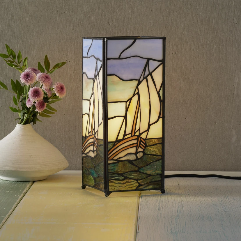 Aus 192 einzelnen Glaselementen wurde bei der Tischleuchte Alvina ein Muster gebildet, das ein Segelschiff auf dem Wasser mit einem farbenprächtigen Himmel darüber zeigt - ein sehr dekoratives Bild! So lässt sich jeder Raum - ob Wohnzimmer, Diele oder Schlafzimmer - mit einer eindrucksvollen, zusätzlichen Lichtquelle ausstatten, die auch unbeleuchtet alle Blicke auf sich zieht. Sobald das Licht eingeschaltet wird, kommt das bildhafte Muster ganz ausgezeichnet zur Geltung.