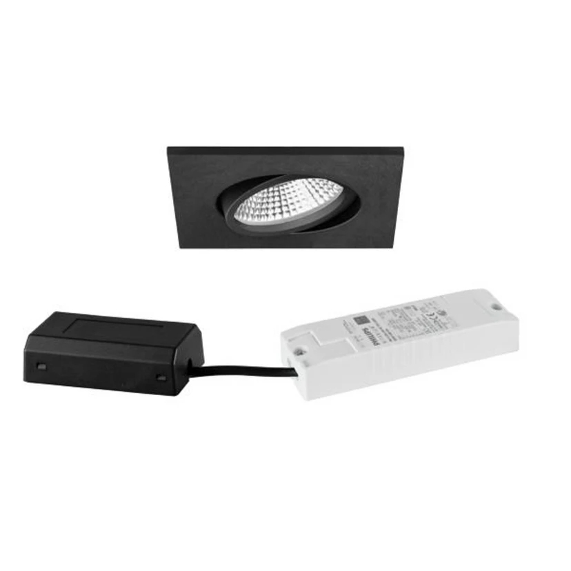 Dieses eckig geformte LED-Downlight BB25 mit schwenkbarem Leuchtenkopf wird als Set inklusive DALI-dimmbarem LED-Treiber und 5-poliger Anschlussbox zur Durchgangsverdrahtung geliefert. Mit Schutzart IP65 staubdicht und vor Strahlwasser geschützt, eignet es sich perfekt, um Wellnessbereiche oder andere Feuchtbereiche im gewerblichen Bereich zu erhellen. Im Abstrahlwinkel von 36° wird das warmweiße Licht der verbauten LEDs abgestraht und durch den silbernen Reflektor mit rotationssymmetrisch tief-breit-strahlender Lichtstärkeverteilung und transparenter Abdeckung aus Kunststoff optimal abgestrahlt. Das Downlight ist mit Einbaufedern bestückt, so dass die Montage werkzeuglos erfolgen kann. Es ist geeignet für Decken mit einer Stärke von bis zu 1,7 cm.