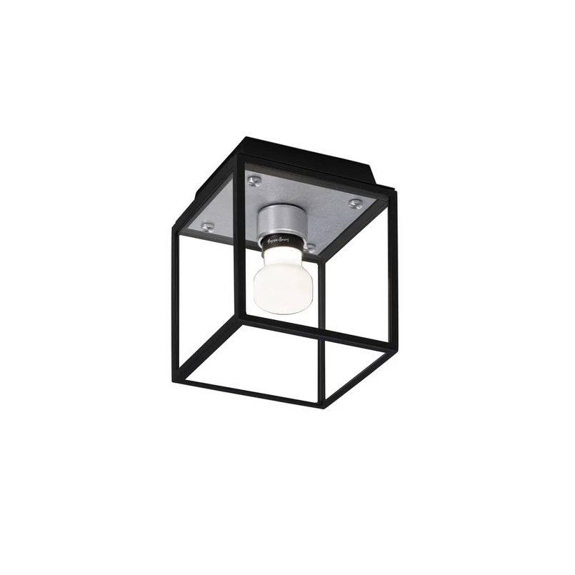 Diese Deckenleuchte mit Käfig besteht aus einem mattschwarzen Metall- und Glaskäfig, der mit einer Rückwand aus Gussmetall ausgeführt ist. Sie verfügt über eine massive Metallfassung mit Kreuzrändelung und charakteristischen Münzschrauben. Diese Leuchte hat die Schutzart IP44, d.h. sie ist für Feuchträume, Bäder und den Außenbereich geeignet.