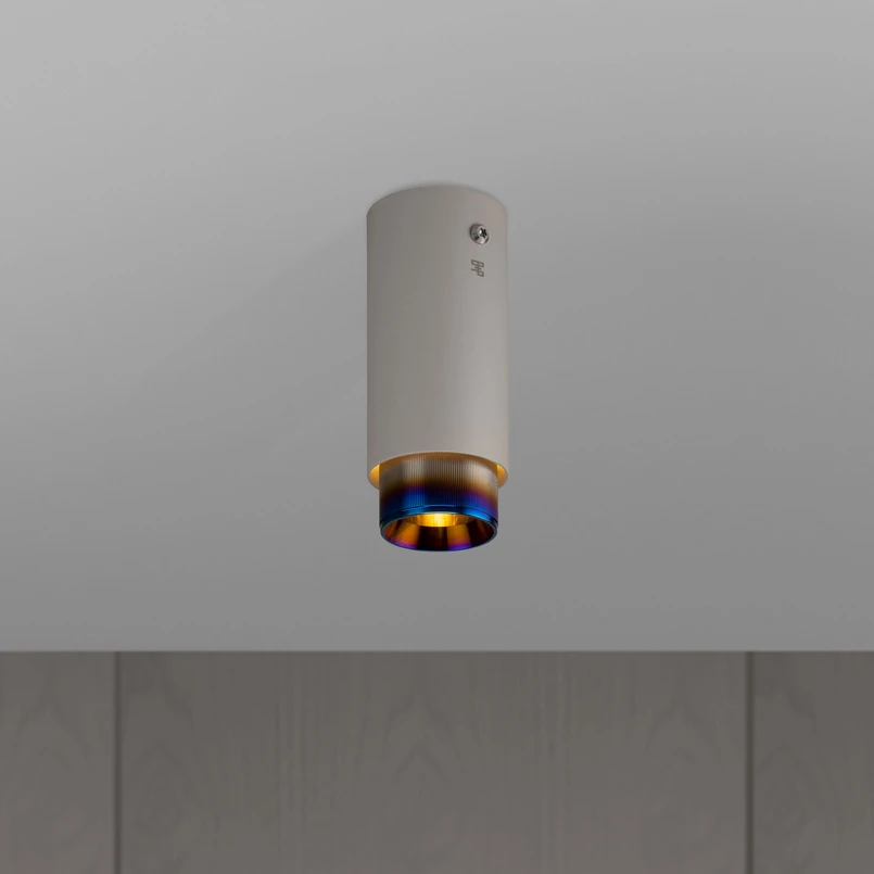 Exhaust Surface ist ein moderner Strahler zur Deckenmontage, der aus einem pulverbeschichteten Edelstahl-Korpus in zylindrischer Form und einem soliden, außen geriffelten Metalleinsatz besteht. Letzterer ist - neben den sichtbaren Torx-Schrauben - das charakteristische Merkmal der Leuchtenserie Exhaust. Der Einsatz sorgt mit seiner abgeschrägten, glänzenden Innenseite für eine gerichtete Lichtabgabe, während ein Wabenfilter vor der GU10-Fassung die Blendwirkung reduziert.