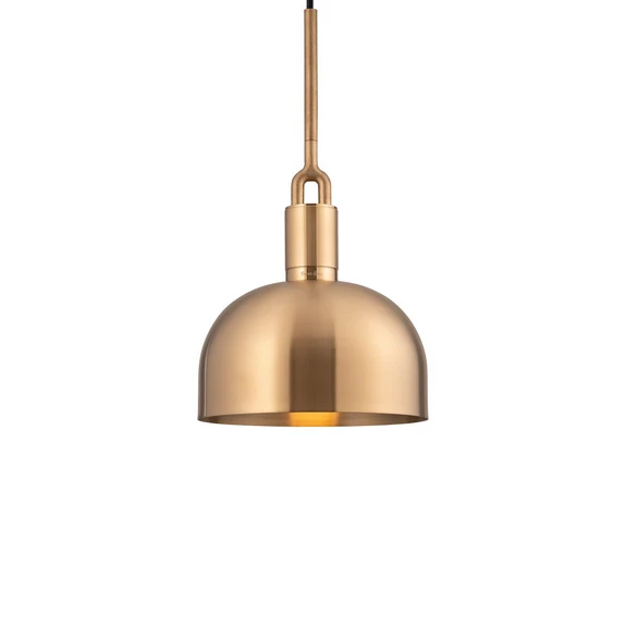 Aus Messing wurde die Hängeleuchte Forked gefertigt. Sie setzt sich aus einem weit geöffneten, ähnlich einer Halbkugel geformten Schirm, einer von Hand mit einem schönen Rändelmuster verzierten Fassung und einem schlichten, runden Baldachin zusammen. Das Rändelmuster mit dem Schriftzug an der Fassung ist das Markenzeichen der Leuchten des Herstellers Buster + Punch und findet sich an jeder Leuchte wieder. Ebenso kennzeichnend für Buster + Punch ist die Verarbeitung von hochwertigen, massiven Metallen bei allen Produkten. Neben Leuchten fertigt das Unternehmen auch Beschläge und Einrichtungsgegenstände. Im Schirm wurde eine E27-Fassung verbaut, ein passendes, warmweiß leuchtendes LED-Leuchtmittel ist im Lieferumfang enthalten. Mit einem für LED-Lampen geeigneten Dimmer lässt sich das Licht außerdem dimmen. Das Licht tritt ausschließlich durch die Öffnung aus dem Metallschirm heraus und erhellt die darunter liegende Fläche, beispielsweise einen Esstisch.