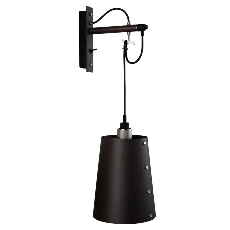 Die charakteristische Gestaltung lässt die Wandleuchte Hooked Wall large zum auffallenden Lichtobjekt in jedem Raum werden. Die Wandleuchte besteht mit Ausnahme des Kabels komplett aus Metall. Schirm und Wandhalterung sind farbig pulverbeschichtet; die Fassung, der Haken zur Abhängung des Schirmes am Ausleger sowie die sichtbaren Schrauben, mit denen das Wandelement befestigt und der Schirm geschlossen ist, bestehen aus farblich abgesetztem Metall. Ein Schalter an der Wandhalterung ermöglicht das Ein- und Ausschalten direkt an der Leuchte, weshalb die Wandleuchte Hooked Wall large auch sehr gut an der Wand neben dem Bett genutzt werden kann, um die Nachttischleuchte zu ersetzen.