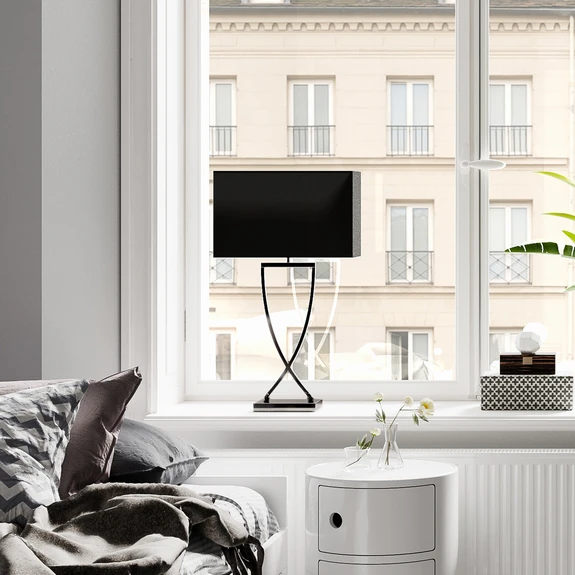 Die Tischleuchte Omega aus dem Hause By Rydéns macht mit dem elegant verkreuzten Metallgestell und dem darauf sitzenden rechteckigen Textilschirm einen sehr ästhetischen Eindruck. Sie findet ihren Platz auf einem Tisch, einer Kommode oder auf dem Fensterbrett und sorgt für eine sehr angenehme Akzentbeleuchtung.