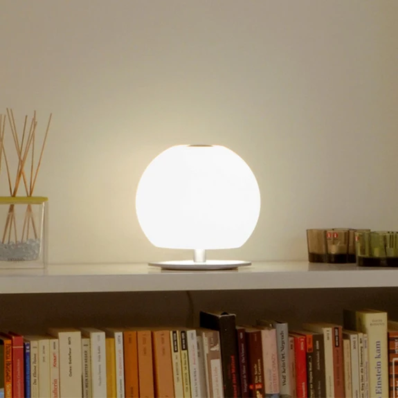 Die kleine Tischleuchte Ball vereint traditionelle Glasbläserei und modernes Design. Ihr namensgebendes Merkmal ist der kugelförmige Schirm mit unterer Öffnung, welcher zwei G9-Leuchtmittel aufnimmt und durch diese gleichmäßig erstrahlt. Auch beim flachen Fuß und dem kurzen, zylindrischen Ständer aus gebürstetem Aluminium dominieren runde Formen. Moderne Wohn- und Aufenthaltsbereiche lassen sich mit Ball als Zusatzlichtquelle oder dekorativer Akzent auf Fensterbank, Tisch, Sideboard oder Regal ideal ergänzen.