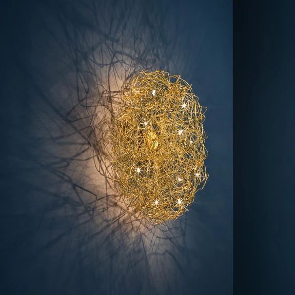Ein Knotengeflecht aus handgeformten und geflochtenen Aluminiumdrähten, die vielfach ineinander verworren sind und somit ganz spezielle Licht- und Schattenmuster an die Wand werfen - das ist die Wandleuchte Fil de Fer CW Ovale. Das Licht der kleinen G4-Lampen kann zu allen Seiten austreten und taucht die ganze Umgebung in dekorative Lichtspiele.