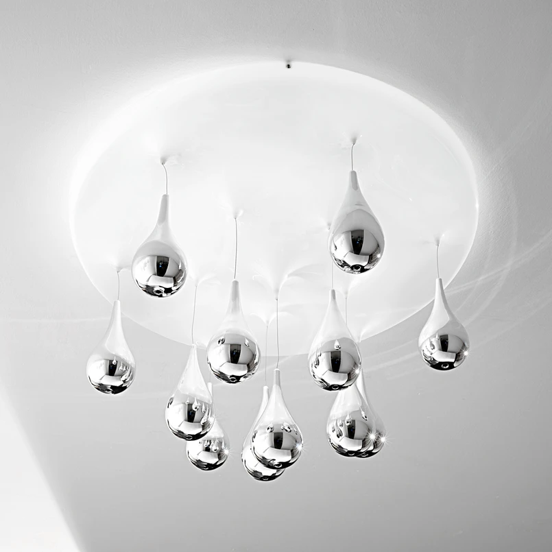 Die Designer Deckenleuchte Pioggia erinnert tatsächlich an die künstlerische Nachahmung der Natur. Ein Himmel, der den jeweiligen Raum mit indirektem Licht versorgt, ist zunächst sichtbar. Wie fallende Regentropfen hängen hier mannigfache verchromte Gläser, die sich scheinbar in Bewegung befinden.