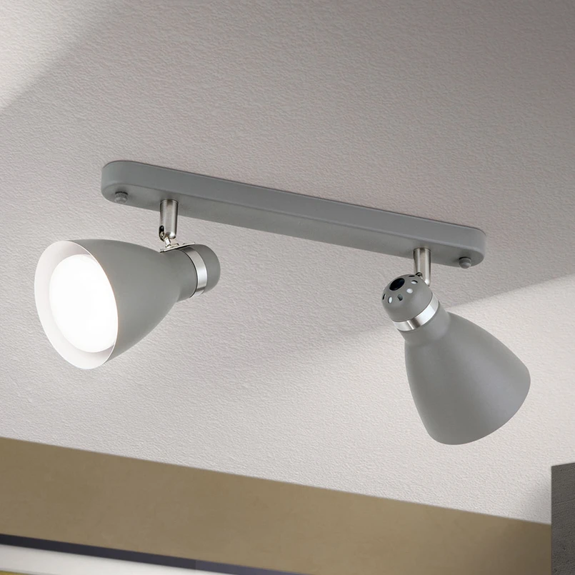 Die moderne Optik macht den zweiflammigen Deckenstrahler School zu einem unverzichtbaren Lichtobjekt für zeitgemäß gestaltete Wohnräume und Flure. Er besteht aus lackiertem Stahl, die beiden Leuchtenköpfe können gedreht werden und ermöglichen so eine individuell bestimmbare Lichtausrichtung. So wird nicht nur eine adäquate Allgemeinbeleuchtung geschaffen, sondern es können auch dunkle Raumwinkel angemessen erhellt werden. Die Optik wird noch durch je einen verchromten Ring im Fassungsbereich aufgelockert.
