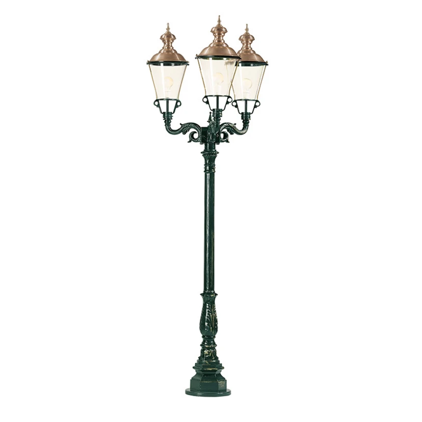 Dieser Kandelaber überzeugt mit seiner stattlichen Höhe, der dreiflammigen Ausführung und klassischer Bauart mit ansprechenden, spitzen Kupfer-Hauben. Dabei trägt diese hochwertige Leuchte nicht nur zu einem repräsentativen Erscheinungsbild von zahlreichen Gartenbereichen bei, sondern erhellt diese auch mit großer Wirkung. Vor allem das klassische Design ist immer wieder schön anzusehen, bewirkt ein stimmungsvolles Ambiente und vermittelt vor allem Sicherheit durch angemessene Beleuchtung.