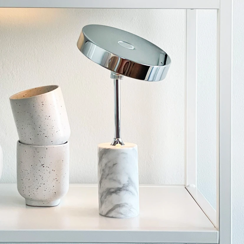 Die LED-Akku-Tischlampe Starlight vereint skandinavisches Design mit Materialien wie Metall und Marmor. Diese Kombination verleiht jedem Raum, sei es Wohnzimmer, Esszimmer oder Schlafzimmer, eine stilvolle Note. Die integrierte LED-Lichtquelle sorgt für energiesparendes Licht, das in einem angenehmen warmweißen Farbton erstrahlt. Der Leuchtenkopf kann