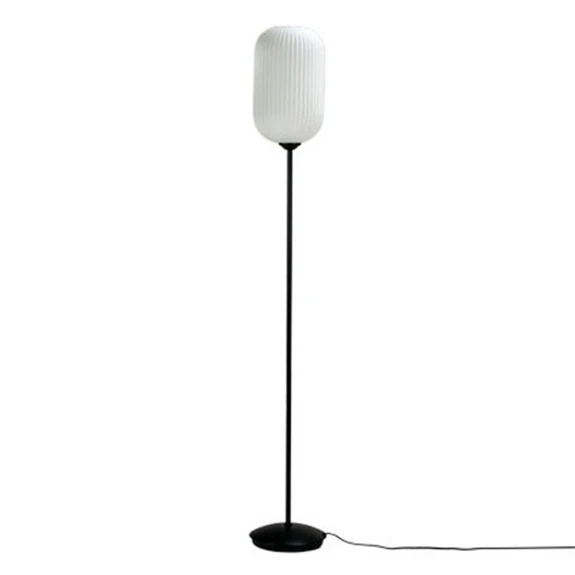 Mit einer sehr schönen, blendfreien Lichtwirkung begeistert die Stehleuchte Riflet durch den opalweißen Schirm aus Glas, der rundum mit einem Rillenmuster gearbeitet wurde und nach oben und unten abgerundet wurde, so dass nur eine kleine Öffnung nach oben bleibt. Er sitzt auf einem in mattem Schwarz gestalteten, schlichten Gestell aus Metall. In den unterschiedlichsten Einrichtungsstilen lässt sich die Stehleuchte dank ihres gleichermaßen klassischen wie auch modernen Designs verwenden. Der Fußschalter zur bequemen Bedienung wurde im schwarz textilummantelten Kabel integriert.