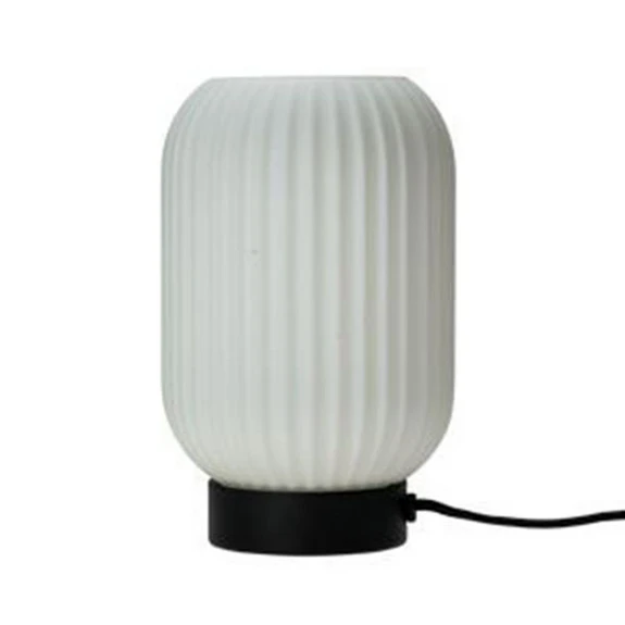 Kleine Tischleuchte Riflet mit weißem Glasschirm mit Rillenmuster