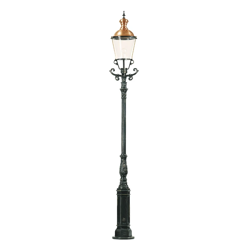 Ihre Eleganz erlangt diese Außenleuchte durch die gelungene Kombination des edlen Kupferdaches, des glasklaren Schirms und des detailliert im antiken Stil gestalteten Mastes. Da kommt historisches Flair auf.