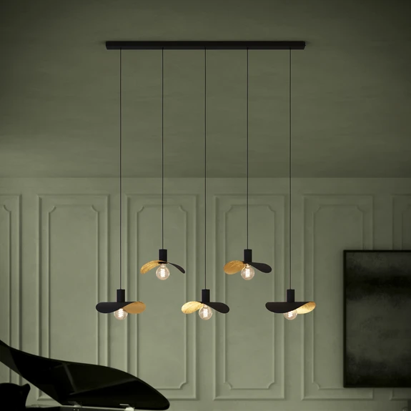 Die Hängeleuchte Saceda vereint elegantes Design mit einer faszinierenden Farbkombination aus Schwarz und Gold. Die fünf gebogenen Teller, die die Schirme bilden, sind auf der Oberseite in mattem Schwarz und unten goldfarben mit schöner Struktur gehalten, was dem abstrahlenden Licht noch mehr Wärme und Behaglichkeit verleiht. Die Leuchte setzt stilvolle Akzente im Ess- oder Wohnzimmer. Die fünf Lichtquellen sorgen für eine gleichmäßige Ausleuchtung eines langen Tisches.