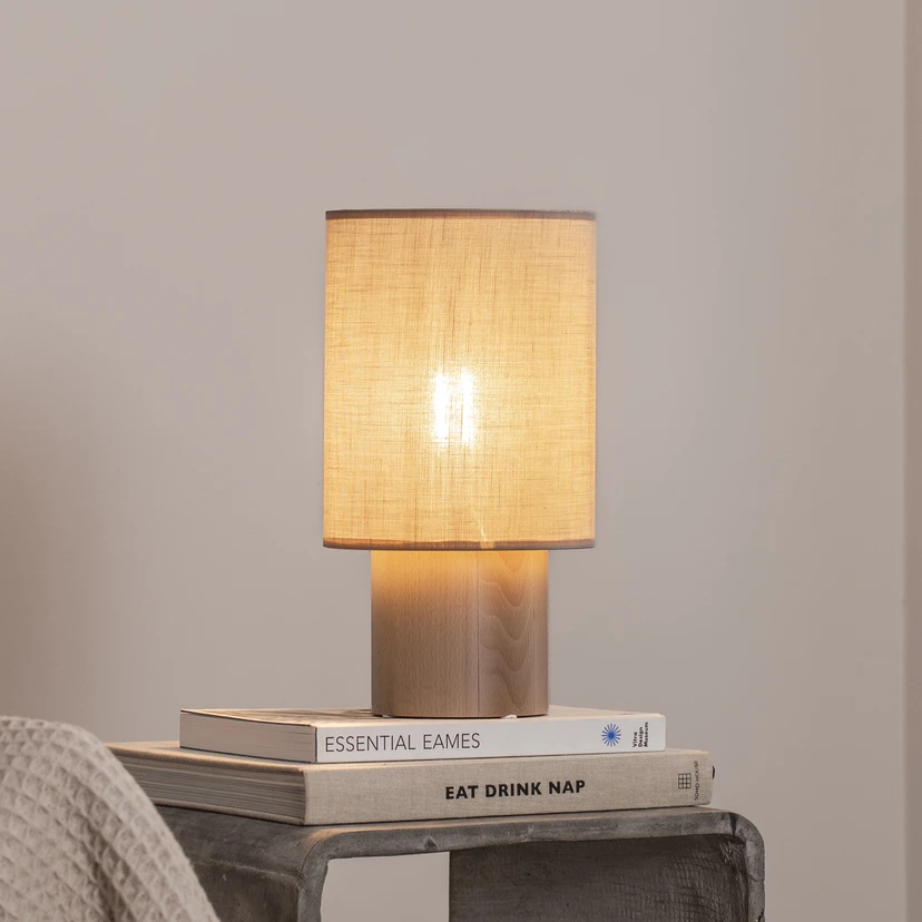 Zylindrische Tischleuchte Asolita mit Holzfuß und beigem Stoffschirm