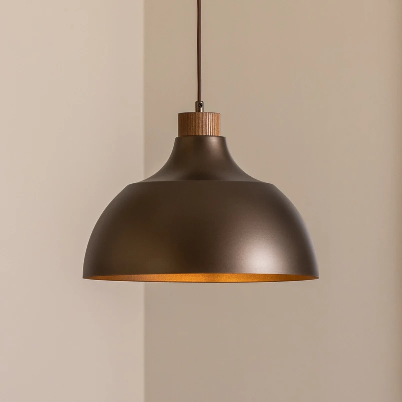 Einflammige Pendelleuchte Kaitt mit rundem Stahlschirm und hellem Holzdetail