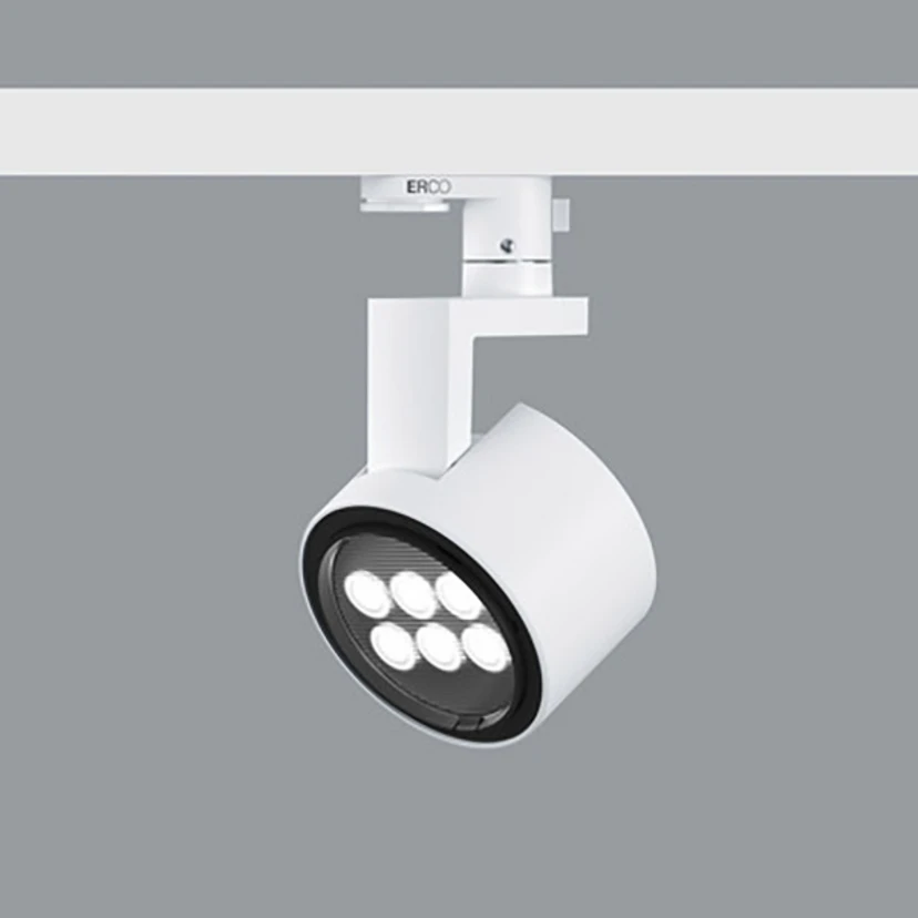 Der Strahler Parscan von ERCO mit leistungsstarken High-Power-LEDs sorgt als Ausstattung einer 230V-Stromschiene für eine hochwertige, flexible Innenbeleuchtung, um mit diffus und großflächig ausgestrahltem Licht Verkaufs-, Präsentations- und Ausstellungsflächen situationsgerecht zu illuminieren oder eine effektive Allgemeinbeleuchtung zu erzielen. Der runde Leuchtenkopf mit Kunststoffabdeckung und der einseitige Haltebügel mit innenliegender Leitungsführung weisen Gehäuse aus pulverbeschichtetem Aluminiumguss auf. Der Bügel ist um 360° drehbar am Schienenadapter (Kunststoff) befestigt und lässt zudem ein Schwenken des Kopfs um 90° zu. Die Charakteristik der Lichtabgabe wird durch eine Spherolit-Linse und Kollimatoroptik aus optischem Polymer erzielt.