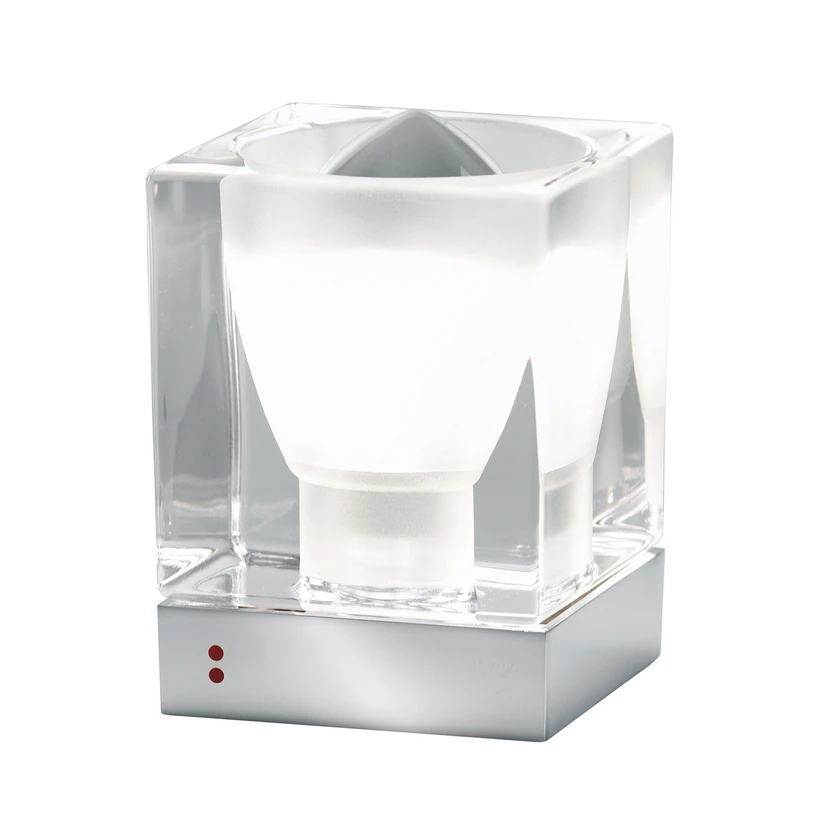 Diese Leuchte aus der vom Studio Pamio Design konzipierten Serie Cubetto schmückt den modernen Innenbereich als leuchtender Akzent. Der Glasschirm ist als kantiger Würfel geformt; ein GU10-Reflektor findet innerhalb einer Aussparung Platz, in deren Bereich das Glas im Sandstrahl-Verfahren mattiert ist. Unterhalb schließt nahtlos ein quadratischer Fuß aus glänzend verchromtem Metall an.