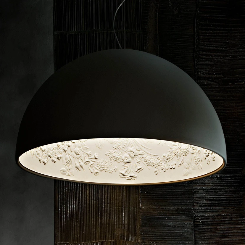 Der kreative Kopf hinter diesem einzigartigen Leuchtendesign heißt Marcel Wanders: Er ließ sich von einer Decke mit Gipsdekorationen in seinem früheren Haus zu dieser Leuchte inspirieren und stattete die Innenseite des Schirms mit in den Gips eingearbeiteten floralen Motiven aus. Im Kontrast dazu wirkt die Oberfläche des Schirms mit der aufgebrachten Flüssiglackierung sehr reduziert in der Formensprache.