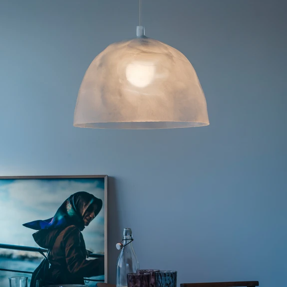 Der Schirm der Hängeleuchte Bump besteht aus einer großen Kuppel aus gemoldetem Kunststoff. Die Oberfläche wirkt leicht zerbeult, was die Optik sehr lebendig macht und die Lichtwirkung effektvoller gestaltet. Ein Lichtspender, der sich hervorragend in die unterschiedlichsten Wohnstile einfügt und sich für die Grund- sowie für die Bereichsbeleuchtung, beispielsweise über einem großen Tisch, anbietet.