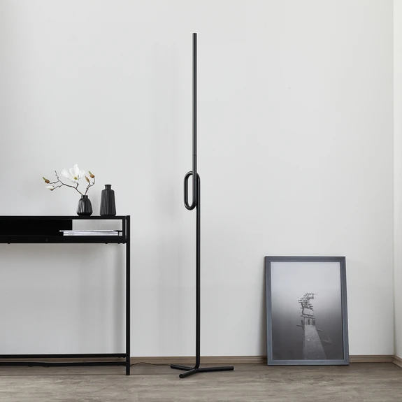 Zentrales Element ist ein dünnes Standrohr, das sich auf halbem Wege entschließt, die Richtung zu wechseln, eine Kehrtwendung macht, um dann doch wieder die ursprüngliche Richtung einzuschlagen. Fast scheint es, als sei der Knick oder die Biegung mittig des Standrohrs versehentlich dorthin gelangt. Doch dieser Knoten dient der Serie Tobia von Foscarini nicht nur als Alleinstellungsmerkmal und Markenzeichen, sondern erfüllt auch rein praktische Zwecke. So dient die Schlinge auch als Griff, an dem man Tobia leicht von einem Ort zum anderen tragen kann. Ein Symbol dafür, dass der Bestimmungsort der Tobia niemals festgelegt ist, sondern je nach Bedarf und Gegebenheit stets variieren kann und soll.