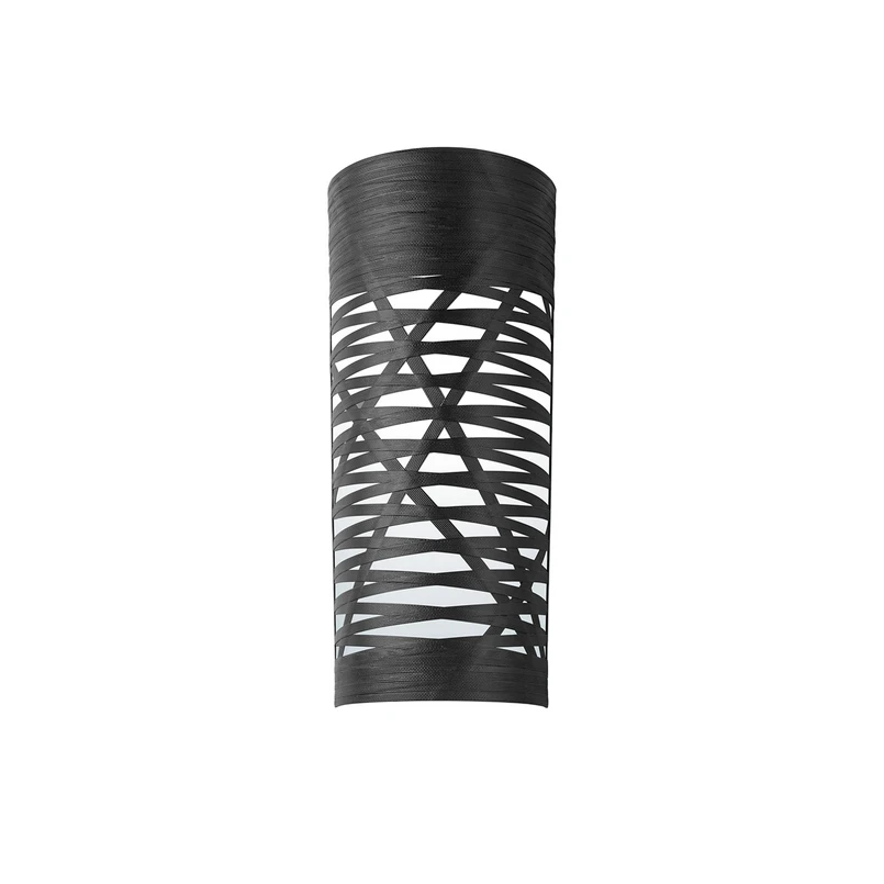 Der abgerundete Schirm der Wandleuchte Tress grande besteht aus Glasfaser-Verbundmaterial. Um es in Form zu bringen, wurde ein schmales Band per Hand um einen sich drehenden Zylinder gewickelt, sodass ein kunstvolles Flechtwerk entsteht. Einzelne Bänder, die schräg von oben nach unten verlaufen, durchbrechen die Grundstruktur und lassen unterschiedlich große Lichtaustritte entstehen. Die Leuchtmittelfassung ist an der Oberseite des Leuchtenschirms angebracht und gibt das Licht nach oben und zum Boden ab, wodurch ein besonders schönes Licht- und Schattenspiel an der Wand entsteht. Außerdem wird das Licht durch die Zwischenräume des Flechtwerks in den Raum gestrahlt. Die Wandleuchte kann flexibel im Wohnbereich genutzt und beispielsweise im Flurbereich, im Wohn- sowie im Schlafzimmer eingesetzt werden.