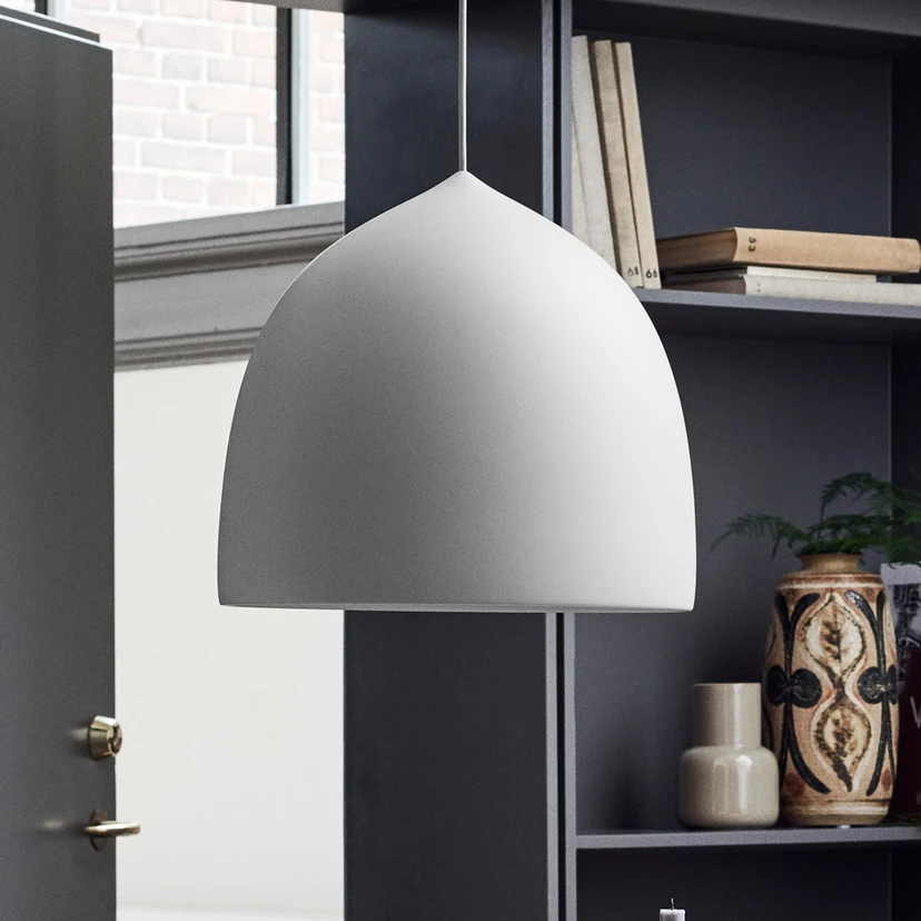 Das Design der Hängeleuchte Suspence™ greift den skandinavischen Funktionalismus auf, bei dem Form und Funktion zwar im Vordergrund stehen, jedoch eine perfekte Symbiose mit der Ästhetik eingehen. Inspirieren ließen sich GamFratesi, die kreativen Köpfe hinter diesem Leuchtenentwurf, von der Bewegung eines in der Luft schwebenden Wassertropfens. So entstand aus dem Material Aluminium ein Schirm mit weicher, fließender Formgebung, der eine vollendete Harmonie ausstrahlt. Harmonisch wirkt auch das Licht, das Suspence™ direkt nach unten durch einen weißen Polycarbonat-Diffusor abgibt. So lässt sich z. B. ein Tisch wundervoll ausleuchten.