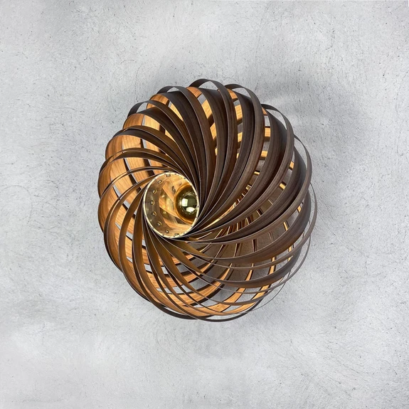 Die nachhaltig gearbeitete Wandleuchte Veneria ist stimmungsvoller Lichtspender und dekoratives Einrichtungsaccessoire zugleich. Die Wandleuchte besteht aus spiralförmig angeordnetem Holzfurnier: Dabei werden breite Lamellen aus Nussbaumholz von schmaleren Streifen desselben Holzes umgeben. So entsteht ein sehr ästhetisches Bild von Licht und Schatten in der Umgebung der Leuchte. Die Lichtabstrahlung aus dem Inneren kommt die Holzmaserung besonders schön zur Geltung. Dabei wird das Licht völlig blendfrei abgegeben. Eine auffällige Lichtquelle für die Beleuchtung von Wohn- und Schlafräumen sowie Fluren.