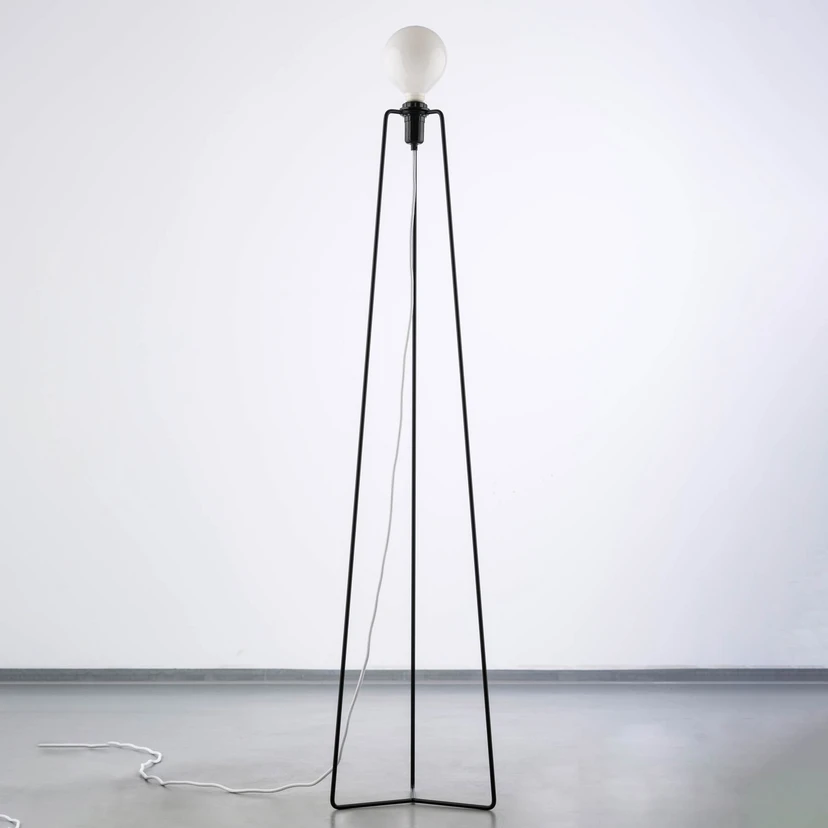 LED-Stehleuchte Model M3 mit filigranem Dreibein-Stahlgestell und Opalglas-Schirm in großer Birnenform