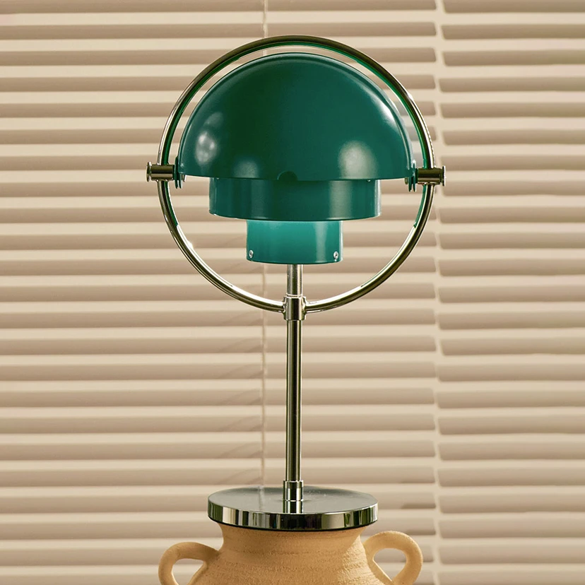 Diese Akku-Tischleuchte fällt überall auch unbeleuchtet auf: Zum einen zeichnet sie sich mit der qualitativ hochwertigen Verarbeitung aus, die die Produkte des dänischen Leuchten- und Möbelherstellers Gubi kennzeichnen. Zum anderen ist der Aufbau unverwechselbar; in einem Messing-Ring sind zwei Viertelkugeln beweglich angebracht, die in beliebiger Position um zwei zentrale Zylinder geschoben werden können. Hierdurch lassen sich das Erscheinungsbild der Leuchte sowie deren Lichtabstrahlung je nach Wunsch verändern. Der Ring dient bei diesem Modell zugleich als Tragegriff. Die Helligkeit des warmweißen Lichts lässt sich in drei Stufen regeln.