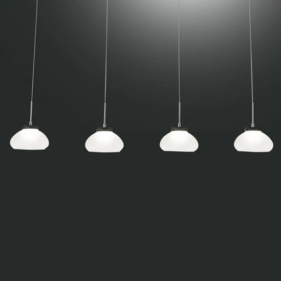 Gerade über Wohn- und Esszimmertischen im modern eingerichteten Wohnbereich ist die Pendelleuchte Arabella ein stilvoller wie funktional überzeugender Lichtspender. Sie ist mit vier runden Glasschirmen bestückt, die regelmäßig nebeneinander an einem schwarzen Baldachin aus Metall aufgehängt sind. Das warmweiße Licht wird durch die unten offenen Schirme direkt emittiert und fällt seitlich durch das Glas als Grundbeleuchtung in den Raum. Die Länge der Aufhängungen kann bei der Montage auf das gewünschte Maß gekürzt werden. Über externe Phasenanschnitts- und Phasenabschnitssdimmer ist der Lichtoutput regelbar.