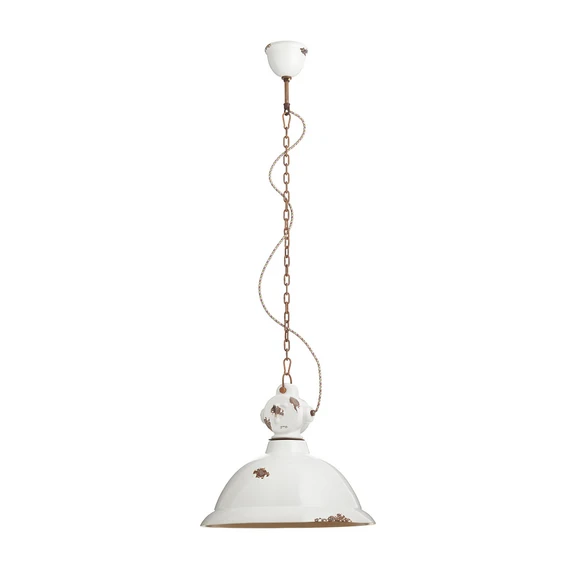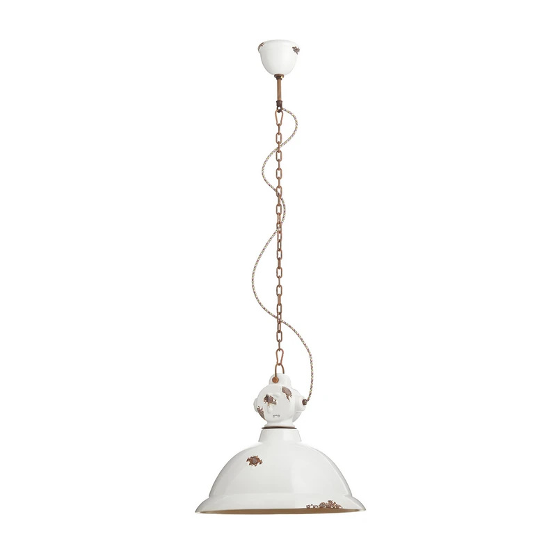 Eine rostbraune Metallkette hält einen großen kuppelförmigen Schirm, der aus Keramik mit einfarbigem Lacküberzug besteht. Durch eine gezielte ungleichmäßige Applikation entsteht der Eindruck von Abnutzungsspuren. Der obere Schirmabschnitt, welcher als Aufnahme für Kette und Kabel dient, ist mit einem großen "F" versehen, das für den italienischen Leuchtenproduzenten Ferroluce steht.