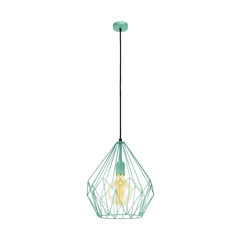 Filigrane Metallstreben in Diamantenform bilden den Schirm dieses Prachtstücks einer Hängeleuchte. Durch das mintfarbene Drahtgestell, das das Leuchtmittel umgibt, wird nicht nur eine besonders farbenfrohe Optik erzeugt, sondern gleichzeitig auch ein einzigartiges Lichtbild erzeugt, was durch die Schattenbildung der einzelnen Metallstreben in eingeschaltetem Zustand entsteht. Doch auch die Seilabhängung, an der der Metallkorb und die E27-Fassung befestigt sind, setzt sich wunderbar vom Rest der Leuchte ab, denn sie ist im Gegensatz zum Schirm in Schwarz gehalten.