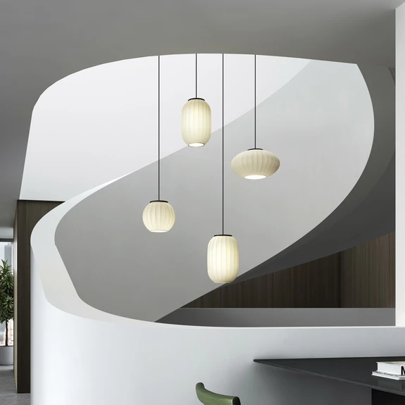 Traditionelle asiatische Lampions dienten den Designern von Nahtrang als Vorbild bei der Konzeption der Pendelleuchte Mei. Ihr Schirm besteht aus weißem Porzellan und ist einer hochovalen Form gestaltet, die mit vertikalen Meridianlinien versehen ist. Die Lichtöffnung an der Unterseite gewährt eine gezielte direkte Beleuchtung für den unterhalb gelegenen Bereich. Eine Kappe auf dem Schirm und ein runder Baldachin aus Metall sowie ein farblich dazu passendes Kabel komplettieren die einflammige Hängeleuchte Mei.