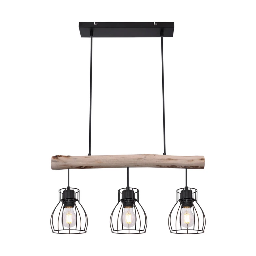 Bei Mina handelt es sich um eine extravagante stilvolle Hängeleuchte aus schwarzem Metall, die nahezu in jedem Raum eine gute Figur macht. An einem herabhängenden Holzbalken befinden sich drei E27-Fassungen, die von einem gitterförmigen, runden Lampenschirm umgeben werden. Durch die freie Wahl des Leuchtmittels können Sie selbst über Lichtstärke und Lichtfarbe dieser Innenlampe bestimmen. Aufgrund ihrer Langlebigkeit empfehlen sich LED-Leuchtmittel.