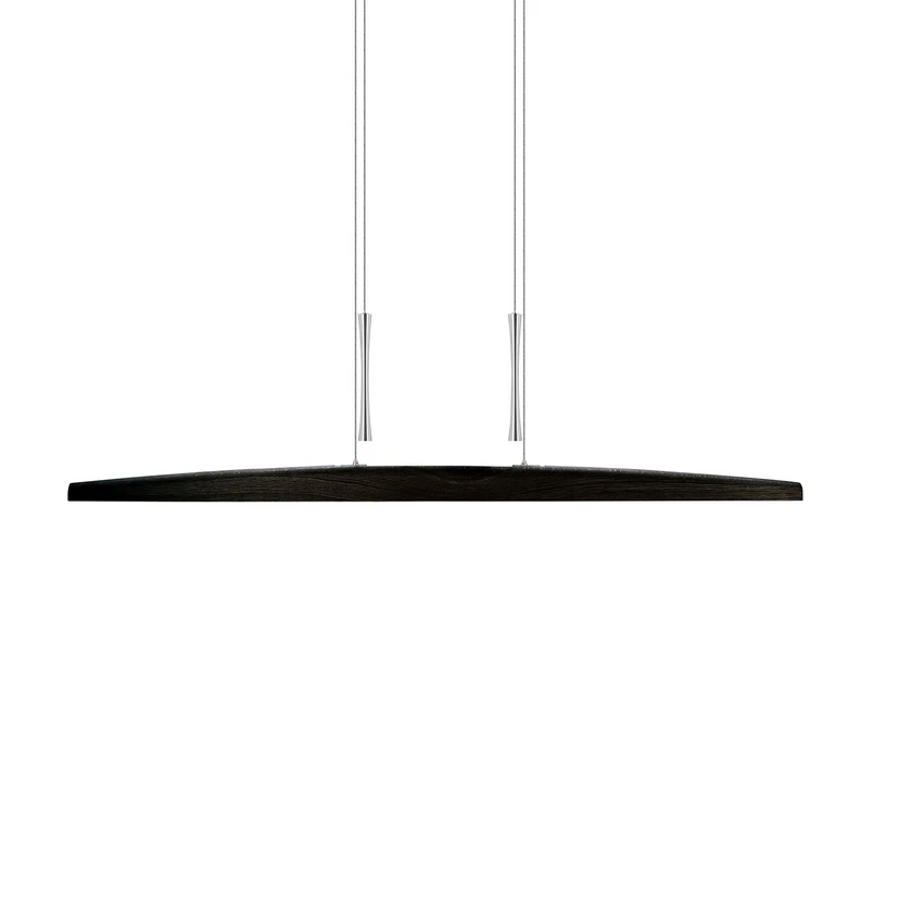Die Balken-Pendelleuchte Arco bietet eine gekonnte Kombination von natürlichem Holz und modernen Metallelementen. Der Holzbalken beherbergt LEDs an Ober- und Unterseite, sodass direkte und indirekte Beleuchtung erzielt werden. Dabei ist dank zweier Touch-Sensoren für Up- und Downlight eine individuelle Regelung der Helligkeit möglich. Die Aufhängung mit schlanken Seilen, welche über Umlenkungen im Baldachin geführt werden und mit schlanken, konkaven Gegengewichten ausgestattet sind, erlaubt eine Justierung der Abpendelhöhe.