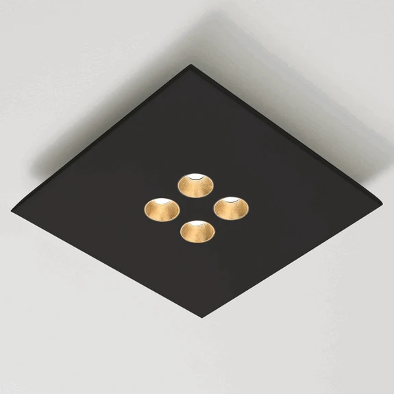 Die quadratische LED-Leuchte Confort überzeugt mit ihrer klaren Formensprache. Die Deckenleuchte, die auch als Wandleuchte installiert werden kann, ist aus schwarz lackiertem Aluminium hergestellt. Die mit farbigem Kontrast ausgestatteten Reflektoren sind mittig angeordnet und besitzen hochmoderne, dimmbare und energiesparende LEDs im Innern. So taucht die LED-Deckenleuchte Confort bei Einschalten den Raum in ein angenehmes, warmweißes Licht.