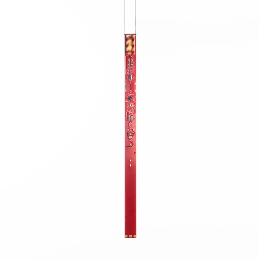 One New Flame, zu Deutsch "eine neue Flamme" - treffender könnte man diese außergewöhnliche Designer-Hängeleuchte wohl nicht betiteln, denn die Leuchte interpretiert das Flackern echten Kerzenlichts auf völlig neue Weise. 256 LEDs, die das Flackern einer echten Kerze täuschend echt simulieren, wurden im oberen Teil des länglichen Leuchtenkörpers verbaut. Die Helligkeit jeder LED liegt bei 6 Lumen, jedoch ist dabei zu beachten, dass nie alle LEDs gleichzeitig leuchten. Videomaterial einer echten Kerzenflamme diente den Designern als Ausgangspunkt für die Produktion dieser Leuchte. Integriert wurde das LED-Display, auf das die Kerzenflamme projiziert wird, in eine 43 cm lange Elektronikplatine, die der Hängeleuchte ihre ungewöhnliche Optik schenkt. Über einen Knopfschalter, der sich inmitten der Platine befindet, kann das Licht gedimmt werden. Verbunden ist die flache Platine über feine Kabel mit dem weißen Deckenbaldachin, so dass keine auffällige Seil- oder Kabelkonstruktion von diesem Aufsehen erregenden Lichtspender ablenken kann. So scheint One New Flame inmitten des Raumes zu schweben, um in unmittelbarer Umgebung eine etwas andere Art von Romantik zu verbreiten.